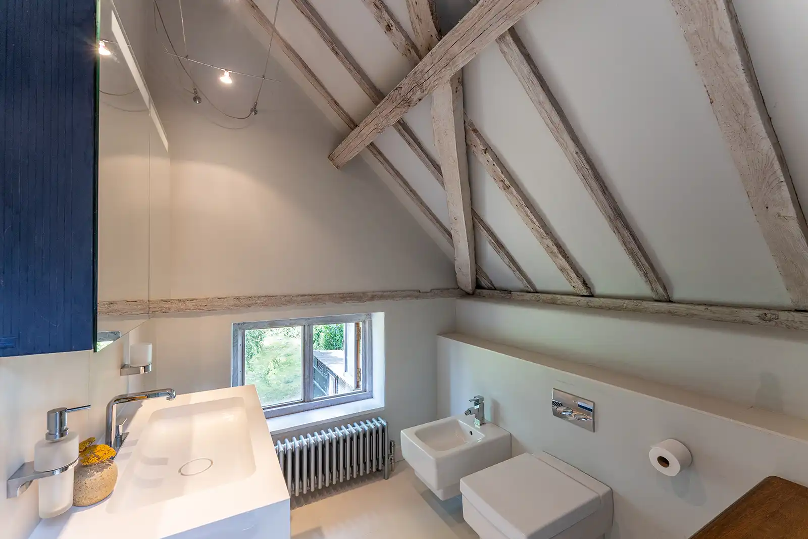 One ensuite bathroom with free standing bath, additional bathroom with shower on the top floor, WC on the ground floor