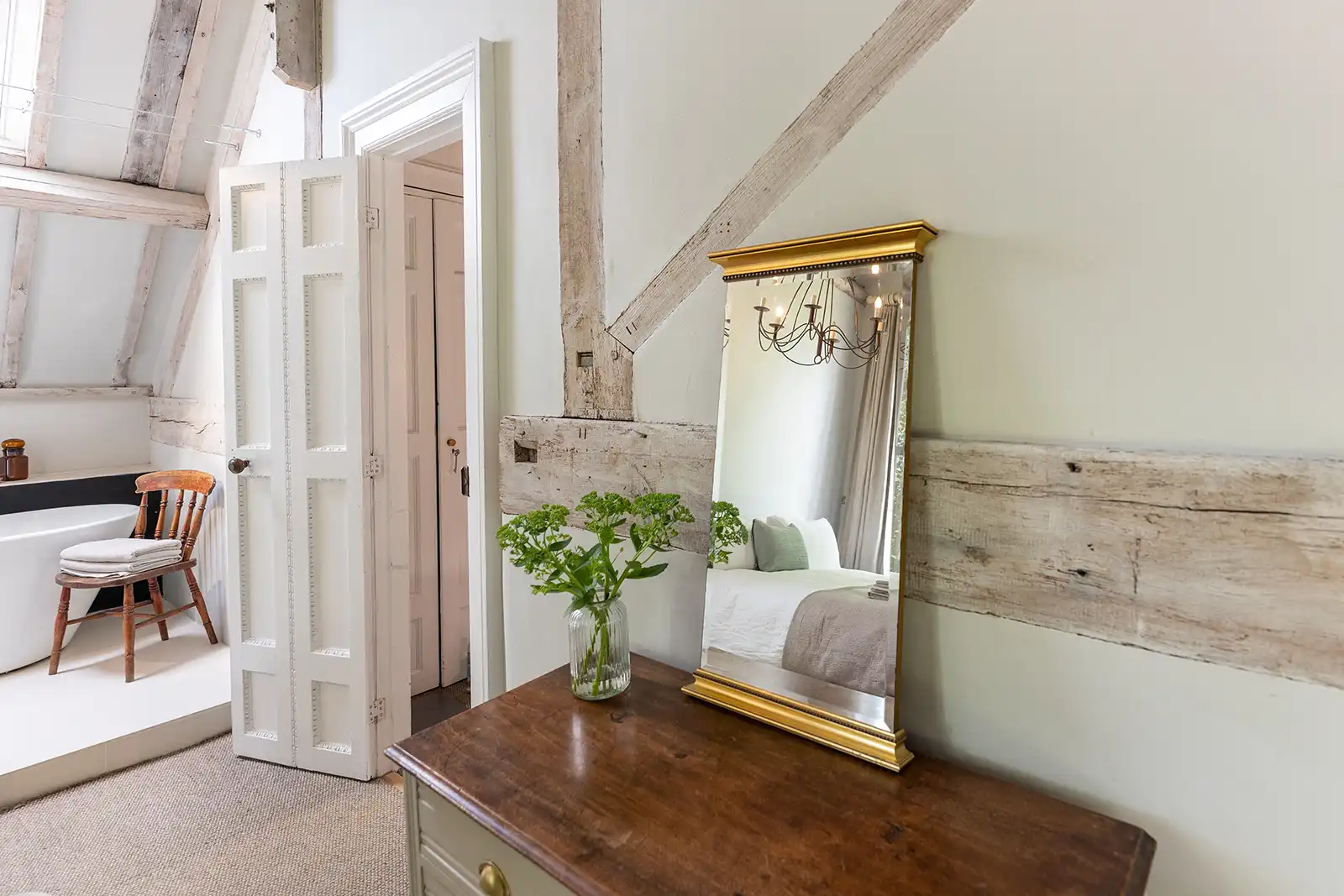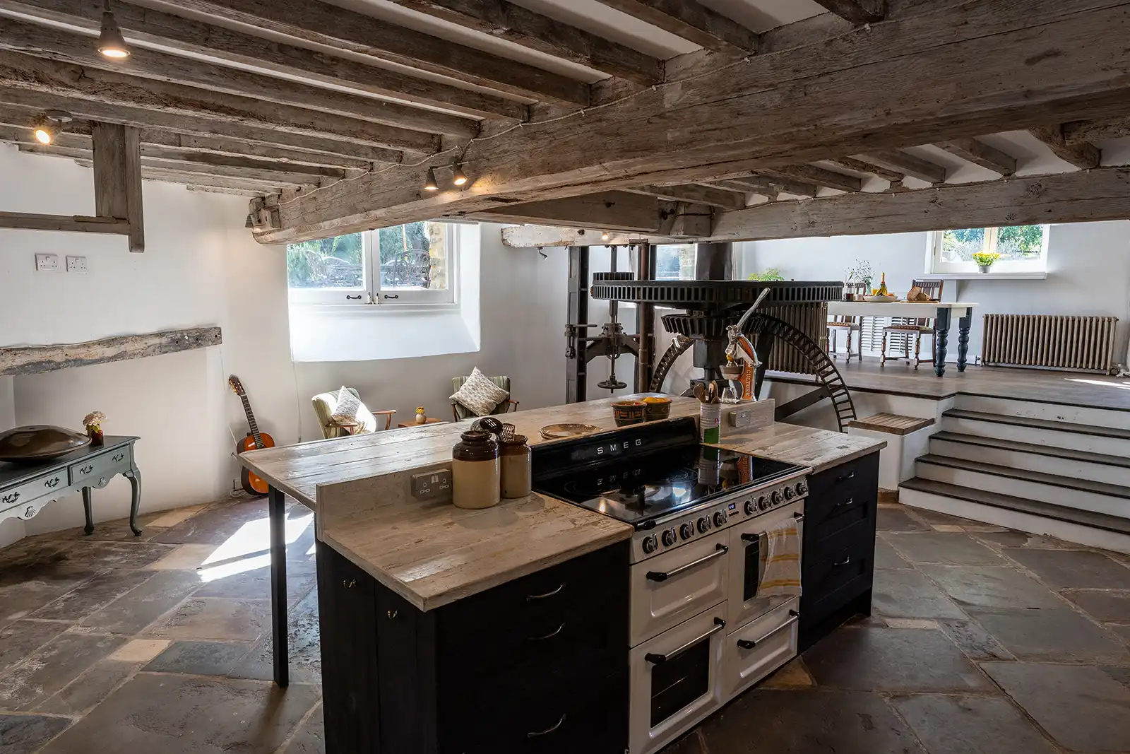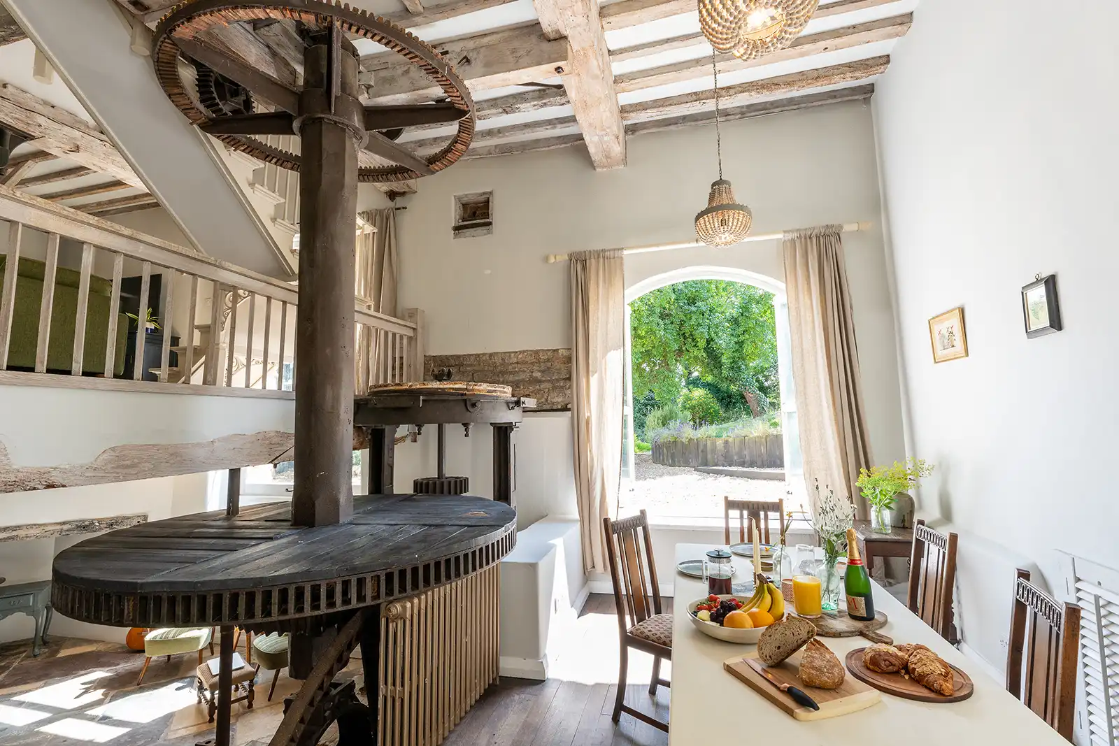 Boddington Mill is a stunning countryside retreat steeped in history and rural charm. The building retains industrial mill parts which intersect multiple levels for a unique and generous living space. Its south-facing garden includes outside dining, wood-fired hot tub, and large lawn, home to wildlife and fruit-bearing trees. Inside, bedrooms feature luxury bedding beneath vaulted, oak-beamed ceilings and period windows. Guests enjoy fine comforts, modern media, and a kitchen fit for the highest culinary ambitions.